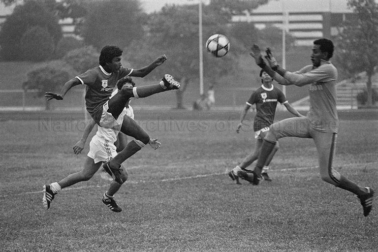 NATIONAL FOOTBALL LEAGUE (NFL) DIVISION ONE FOOTBALL MATCH BETWEEN FARRER PARK DYNAMOS AND TAMPINES ROVERS AT TOA PAYOH STADIUM. MATCH ENDED IN A 1-1 DRAW AS TAMPINES'S V SUNDRAM MOORTHY SCORES AGAINST GOALKEEPER S SIVAJOTHI IN THE SIXTH MINUTE