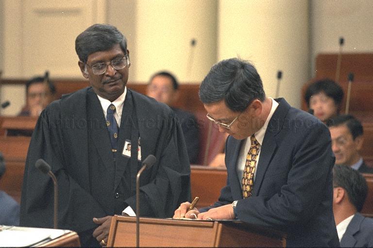 MEMBER OF PARLIAMENT (MP) FOR JALAN BESAR GROUP REPRESENTATION CONSTITUENCY (GRC) CHOO WEE KHIANG SIGNS OATH/AFFIRMATION FORM AS MP AT SWEARING-IN CEREMONY DURING FIRST SESSION OF NINTH PARLIAMENT AT PARLIAMENT HOUSE