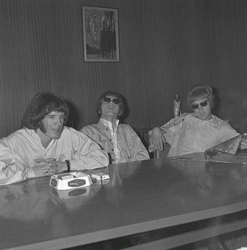 PRESS CONFERENCE WITH THE WALKER BROTHERS, A POP-GROUP, AT DONALD MOORE CONCERTS LIMITED'S OFFICE. THE GROUP, FROM AMERICA, WENT TO LONDON A YEAR AGO WITH BEATLES' HAIRSTYLE AND MADE IT GOOD. FROM LEFT, CARY, JOHN AND SCOTT. THEY ARE IN SINGAPORE FOR A JOINT CONCERT WITH THE YARDBIRDS, ANOTHER POP GROUP, AT THE NATIONAL THEATRE