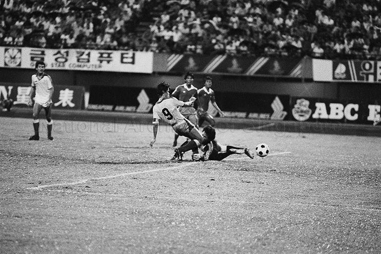 SINGAPORE'S AU-YEONG PAK KUAN (NUMBER 9) SCORING FIRST GOAL IN A MATCH WHERE SINGAPORE WON 5-0 AGAINST INDONESIA AT NATIONAL STADIUM