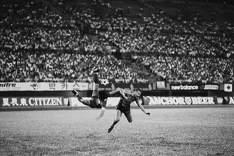 SOUTH KOREAN STRIKER LEE HYUN CHUL (LEFT) FALLING AFTER A CHALLENGE FROM AUSSIE GRAHAM JENNINGS IN A 2ND MERLION CUP SEMI-FINAL FOOTBALL MATCH BETWEEN AUSTRALIA AND SOUTH KOREA WHERE AUSTRALIA WON 3-1 AT NATIONAL STADIUM