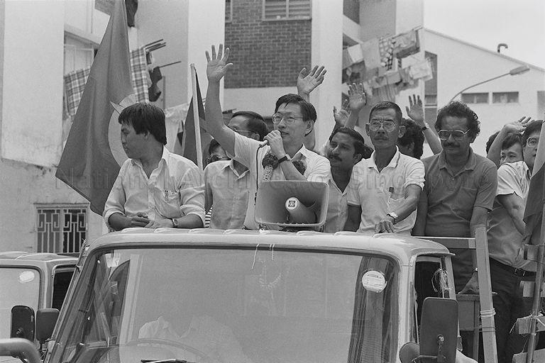 Singapore Democratic Party (SDP) Secretary-General Chiam See Tong (holding microphone) on a victory parade after his election victory in Potong Pasir Constituency