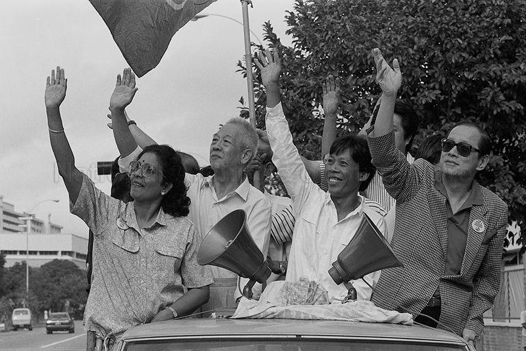 WORKERS' PARTY OF SINGAPORE (WP) CANDIDATES FOR EUNOS GROUP REPRESENTATION CONSTITUENCY (GRC) (FROM RIGHT) FRANCIS SEOW, MOHD KHALIT BIN MOHD BABOO AND DR LEE SIEW CHOH THANKING VOTERS AFTER ELECTION DEFEAT