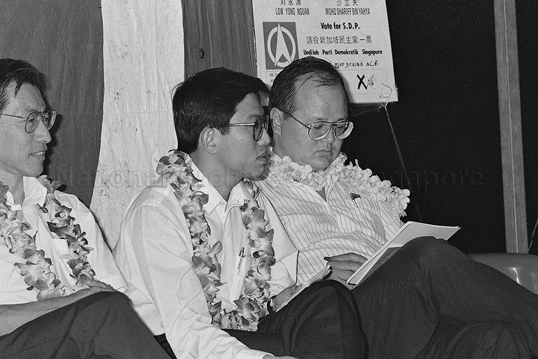 SINGAPORE DEMOCRATIC PARTY (SDP) CANDIDATES FOR MARINE PARADE GROUP REPRESENTATION CONSTITUENCY, DR CHEE SOON JUAN (CENTER) AND ASHLEIGH SEOW CHUAN HOCK (RIGHT) WITH MEMBER OF PARLIAMENT FOR POTONG PASIR CHIAM SEE TONG (LEFT) AT A SDP RALLY FOR BY-ELECTION
