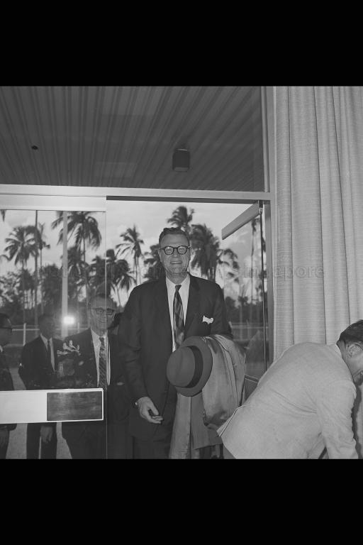 POLITICAL SCIENTIST AND SOCIOLOGIST PROFESSOR LUCIAN W PYE, PART OF A FIVE-MAN GROUP OF VISITING MASSACHUSETTS INSTITUTE OF TECHNOLOGY (MIT) ARRIVING AT SINGAPORE AIRPORT TO STUDY SINGAPORE'S DEVELOPMENT PROBLEMS AT INVITATION OF PRIME MINISTER LEE KUAN YEW
