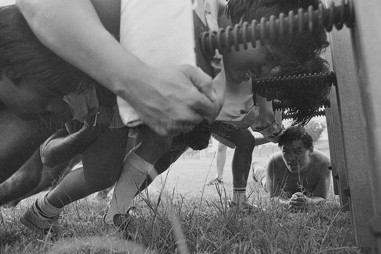 NATIONAL CARETAKER RUGBY COACH SONG KOON POH LOOKING ON AS NATIONAL RUGBY PLAYERS TACKLE A SCRUM-MACHINE DURING A TRAINING SESSION AT UNITED WORLD COLLEGE