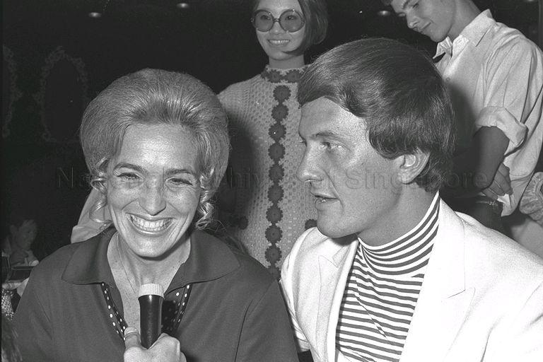 HOLLYWOOD STAR PAT BOONE (RIGHT) AND HIS WIFE SHIRLEY ARRIVES AT SINGAPORE AIRPORT. THEY WILL BE FLYING OFF TO BANGKOK FOR PAT'S LAST STOP IN HIS FAR EASTERN TOUR.
