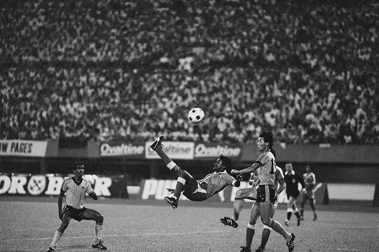 SINGAPORE'S V SUNDRAM MOORTHY EXECUTING A BICYCLE KICK AS MALAYSIA'S WONG HUNG NUNG (RIGHT) AND G TORAIRAJU (LEFT) ATTEMPTS TO STOP HIM IN A OVALTINE CUP FOOTBALL MATCH BETWEEN SINGAPORE AND MALAYSIA AT NATIONAL STADIUM