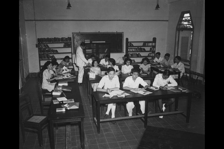 ABOUT 30 STUDENTS STUDYING IN POST-SCHOOL CERTIFICATE CLASS OF ST ANDREW'S SCHOOL, SINGAPORE FOR ENTRANCE TO UNIVERSITY OF MALAYA WITH PRINCIPAL MR FRANCIS THOMAS IN CHARGE OF THE CLASS