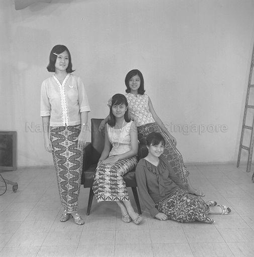 RIGHT TO LEFT : SCHOOLGIRL MODELS, YEONG SAU VUN, 16, WEARS THE 'KAIN SARONG', LEONG LIN YEOW, 16, IN A BLUE, DARK BROWN AND PINK 'LEPAS SARONG', GOH MEI LING, 17, MODELS HER SARONG WHICH SHE CREATED IN YELOOW GOLD, OLIVE GREEN AND BROWN, AND PAULINE YEONG, 17, WEARING HER 'LEPAS SARONG' PATTERNED IN BLUE, MAROON AND BROWN.