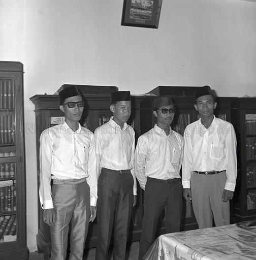 THREE STUDENTS FROM THE ALJUNIED ARABIC SCHOOL IN VICTORIA STREET WERE GIVEN SCHOLARSHIPS BY THE LEMBAGA BIASISWA KENANGAN MAULUD (LBKM) - PROPHET MUHAMMAD'S BIRTHDAY MEMORIAL SCHOLARSHIP FUND BOARD TO FURTHER THEIR STUDIES AT AL-AZHAR UNIVERSITY IN EGYPT. FROM LEFT, MOHKTAR HAJI ABDUL AZIZ, MOHAMAD KAMAL BIN AHMAD AND SHAHARI HAJI ABDUL HAMID. ON THE RIGHT IS USTAZ (TEACHER) ABU BAKAR HAJI HASHIM FROM THE AL-AZHAR UNIVERSITY.