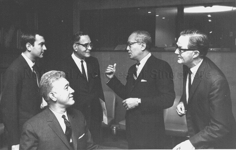 MEETING OF THE UNITAR BOARD OF TRUSTEES AT THE SIXTH SESSION, FROM LEFT TO RIGHT: CORNELIU MANESCU, GENERAL ASSEMBLY PRESIDENT (SEATED) AND HIS INTERPRETER SERGIU CELAC, UNDER-SECRETARY FOR SPECIAL POLITICAL AFFAIRS DR RALPH J. BUNCHE, UNITED NATIONS SECRETARY-GENERAL U THANT AND CHAIRMAN OF THE BOARD KENNETH YOUNGER