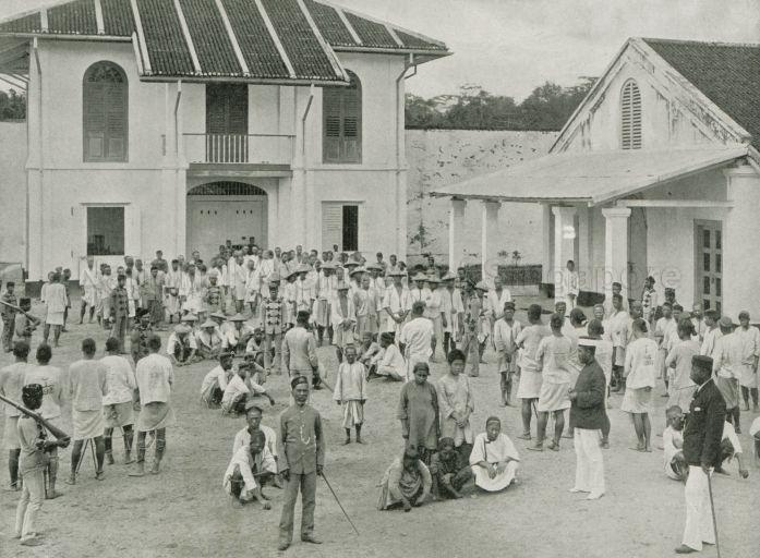 PRINT SHOWING PRISONERS IN THE CONVICT GOAL COMPOUND AT BRAS BASAH, TAKEN BY G.R LAMBERT & CO., C.1900