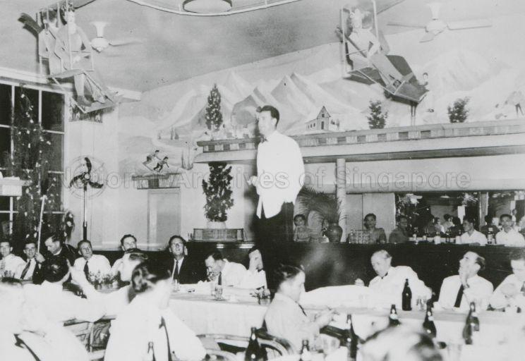 SINGAPORE. THE COMMANDING OFFICER OF NO 1 SQUADRON RAAF, SQUADRON LEADER WILLIAMSON, STANDING ON THE TABLE GIVING A SPEECH AT THE SQUADRON'S CHRISTMAS DINNER HELD IN THE RAFFLES HOTEL, C. 1950