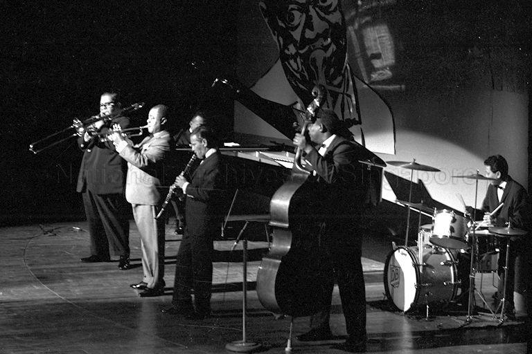 LOUIS ARMSTRONG, JAZZ TRUMPETER, AND HIS BAND PERFORMING AT THE NATIONAL THEATRE