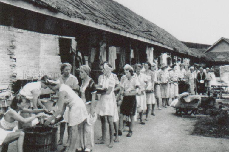JAPANESE OCCUPATION, 1942 TO 1945 : SIME ROAD CAMP, SYONAN-TO. INTERNED WOMEN QUEUEING UP FOR THEIR RATIONS, TOO INSUFFICIENT TO MAINTAIN LIFE. LATER, PERMISSION WAS OBTAINED TO PURCHASE FOOD FROM OUTSIDE.