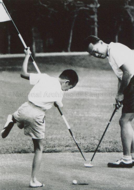 PRIME MINISTER LEE KUAN YEW OF SINGAPORE WITH HIS SON, LEE HSIEN LOONG AT GAME OF GOLF AT THE ISTANA GROUND IN 1965.