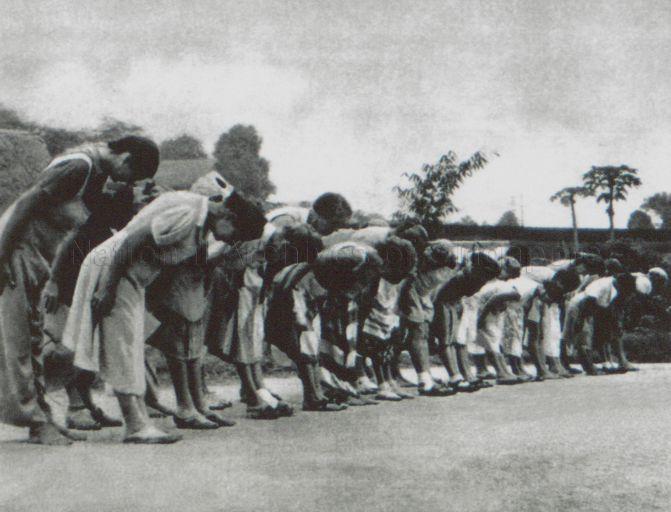 JAPANESE OCCUPATION, 1942 TO 1945 : SIME ROAD CAMP, SYONAN-TO. HUMILIATION WAS HOURLY INFLICTED ON THE CAUCASIAN WOMEN INTERNEES WHO WERE FORCED TO BOW IN FEAR TO THEIR JAPANESE GUARDS WHENEVER THEY MET.