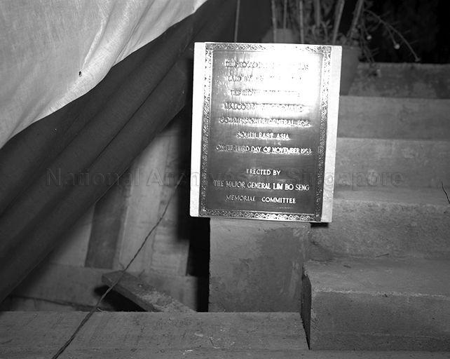 THE FOUNDATION STONE AT MAJOR-GENERAL LIM BO SENG'S MEMORIAL WAS LAID BY COMMISSIONER-GENERAL MALCOLM MACDONALD AT QUEEN ELIZABETH WALK. MAJOR-GENERAL LIM BO SENG LED CHINESE GUERILLAS OF FORCE 136 AGAINST THE JAPANESE ARMY IN MALAYA BUT WAS BETRAYED TO KEMPEITAI. HE WAS TORTURED TO DEATH IN BATU GAJAH PRISON BUT NEVER REVEALED THE SECRETS OF THE MEN FIGHTING TO FREE MALAYA