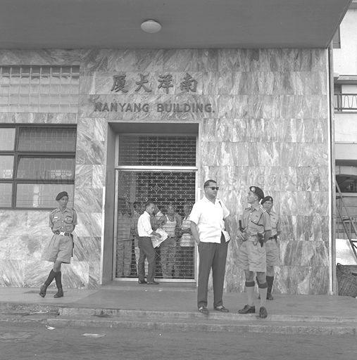 POLICE GUARD OUTSIDE THE NANYANG SIANG PAO BUILDING AS NANYANG UNIVERSITY STUDENT PROTESTORS ARE EXPECTED TO APPEAR ANYTIME