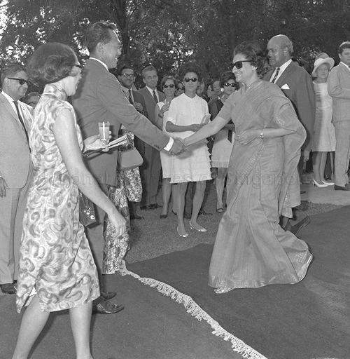 INDIAN PRIME MINISTER MRS INDIRA GANDHI GREETED BY PRIME MINISTER LEE KUAN YEW UPON HER ARRIVAL FOR THE GARDEN PARTY HELD IN HER HONOUR AT BHARAT BHAVAN, RESIDENCE OF THE INDIAN HIGH COMMISSIONER TO SINGAPORE. ON MRS GANDHI'S RIGHT IS THE INDIAN HIGH COMMISSIONER TO SINGAPORE, SURENDER SINGH ALIRAJPUR.