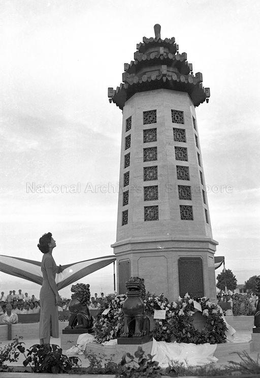 MISS LIM OON GEOK, DAUGHTER OF THE LATE MAJOR-GENERAL LIM BO SENG, ADMIRING THE 12-FOOT CONCRETE AND MARBLE PAGODA DEDICATED TO HIS MEMORY