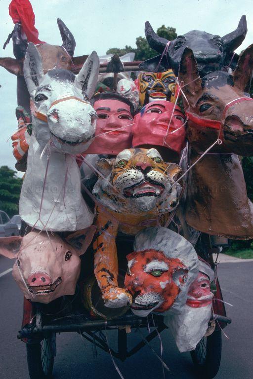 A MASK MAKER WHO WAS WELL-KNOWN IN SINGAPORE IN THE 1970S AND 1980S CALLED BUANKOK. HE TOOK HIS THREE-WHEELED VEHICLE AND CYCLED ALL OVER SINGAPORE SELLING HIS MASKS AND ARTEFACTS, C. 1980S