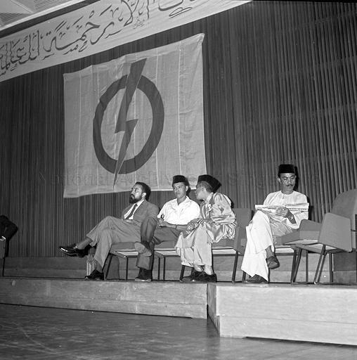 PROFESSOR SYED HUSSEIN AL-ATTAS (LEFT), MINISTER FOR SOCIAL AFFAIRS AND CULTURE OTHMAN WOK (SECOND LEFT) AND TUAN HAJI YA'ACOB BIN MOHD (RIGHT) AT PROPHET MUHAMMAD'S BIRTHDAY CELEBRATION AT SINGAPORE CONFERENCE HALL