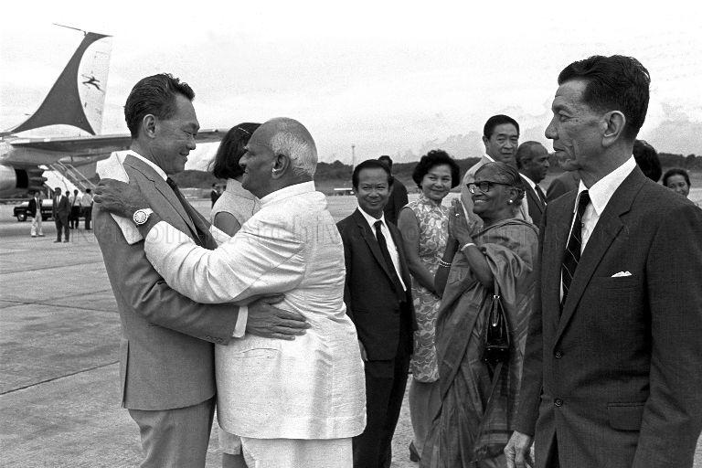 STATE VISIT OF INDIAN PRESIDENT TO SINGAPORE - PRESIDENT V V GIRI OF INDIA AND PRIME MINISTER LEE KUAN YEW EMBRACE IN FAREWELL JUST BEFORE PRESIDENT GIRI TOOK OFF FOR HOME. THIS WARM SHOW OF FRIENDSHIP MARKED THE END OF A HIGHLY SUCCESSFUL THREE-DAY STATE VISIT BY THE INDIAN PRESIDENT, HIS WIFE AND ENTOURAGE OF 24. THE PRESIDENT WAS GIVEN A FULL CEREMONIAL SEND-OFF BY PRESIDENT DR BENJAMIN SHEARES (RIGHT) AND THE CABINET WITH A 21-GUN SALUTE.