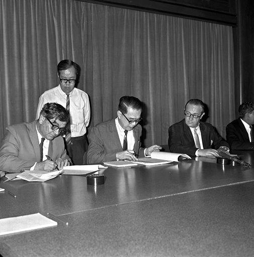 THE SIGNING OF AGREEMENT BETWEEN A NEW GOVERNMENT COMPANY, SINGAPORE ELECTRONIC AND ENGINEERING (PRIVATE) LIMITED AND THE PHILIPS INDUSTRIES LIMITED OF AUSTRALIA. THE AGREEMENT WAS TO APPOINT PHILIPS INDUSTRIES LIMITED OF AUSTRALIA AS ITS MANAGING AGENT. HON SUI SEN IS ON THE THIRD LEFT