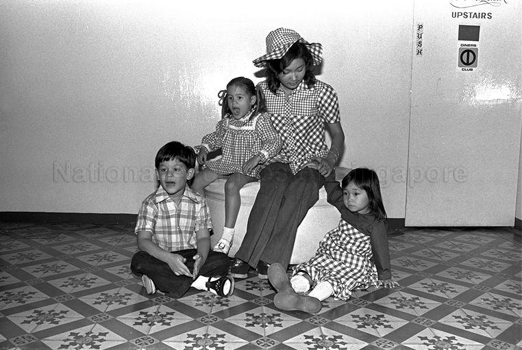 CHILDREN'S FASHION AT BIBI AND BABA, ORCHARD ROAD. DRESSES OF DENIM OR GINGHAM ARE WASHABLE AND WEARABLE. PICTURE SHOWS GINGHAM IN THE LATEST STYLES. THE RED AND BLUE SMOCK TOP WORN BY SOON ENG (THIRD LEFT) IS TEAMED WITH BLUE BRUSHED-DENIM PANTS, AT $14.90 EACH. THE BLUD AND RED GINGHAM MAXI, MODELLED BY SHARON (RIGHT) COSTS $17.90. THE SMOCK, IN RED AND WHITE WORN BY NGAIRE (SECOND LEFT) AT $12.90. ROGER'S (LEFT) BRUSHED DENIM BLUE PANTS COSTS $9.90 AND YELLOW SHIRT $4.90