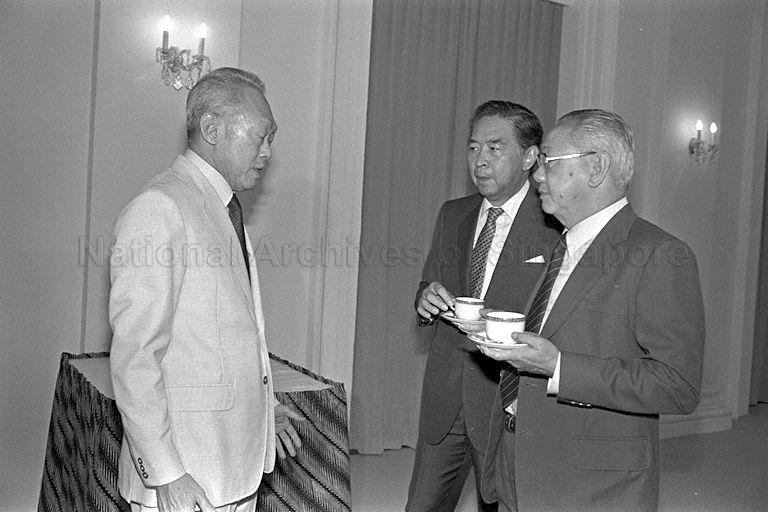 SWEARING-IN OF PRESIDENT WEE KIM WEE AT THE ISTANA - PICTURE SHOWS PRIME MINISTER LEE KUAN YEW WITH SPEAKER OF PARLIAMENT DR YEOH GHIM SENG AND PORT OF SINGAPORE AUTHORITY (PSA) CHAIRMAN LIM KIM SAN AT THE RECEPTION