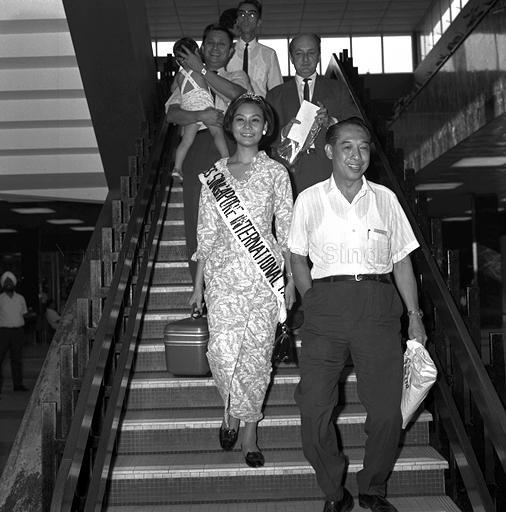 MADELEINE TEO (RIGHT), A 19-YEAR OLD SECRETARIAL STUDENT LEAVING FOR TOKYO FOR MISS INTERNATIONAL BEAUTY PAGEANT CONTEST.