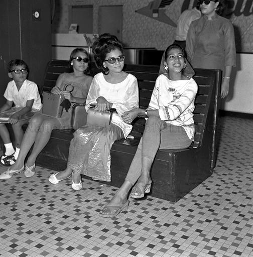 MISS SINGAPORE 1968 YASMIN SAIF (RIGHT) CAUSED A STIR AT PAYA LEBAR AIRPORT WHEN SHE LEFT FOR HONOLULU - FIRST STOP ON HER JOURNEY TO MIAMI BEACH TO TAKE PART IN THE MISS UNIVERSE CONTEST. YASMIN, 19, A DANCER, WAS CLAD IN A PAIR OF SKIN-TIGHT JEANS, T-SHIRT, HIGH-HEELED SANDALS AND WITH HER LONG PLAITED HAIR COVERED BY A GREEN SCARF. FLYING WITH HER WAS MISS MALAYSIA, MAZNAH BTE MOHAMMED ALI, WHO IS A 20-YEAR OLD PRIVATE SECRETARY WORKING IN KUALA LUMPUR, WAS DRESSED IN A WHITE AND RED SARONG KEBAYA