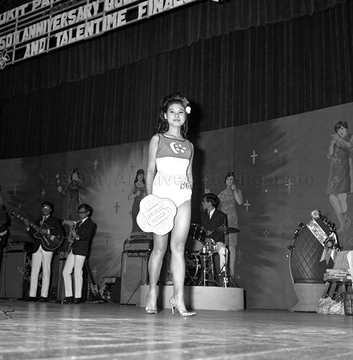 150TH ANNIVERSARY QUEEN OF SINGAPORE BEAUTY CONTEST ORGANISED BY THE BUKIT PANJANG CONSTITUENCY AT THE NATIONAL THEATRE. ROSIE LEE, ONE OF THE FINALISTS IN HER SELF-MADE 'NATIONAL SWIMSUIT'
