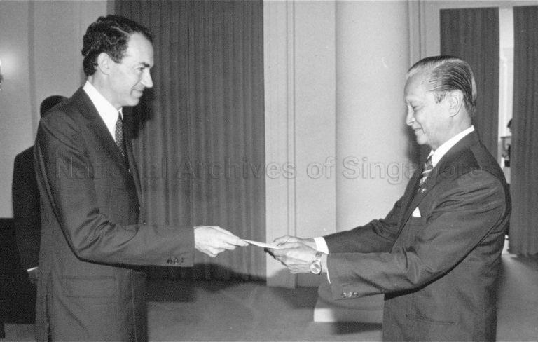 BELGIAN AMBASSADOR CARLOS DE WEVER (LEFT) PRESENTING CREDENTIALS TO PRESIDENT WEE KIM WEE AT THE ISTANA