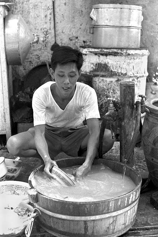 A HAWKER WASHING DISHES AT A PUBLIC STAND PIPE