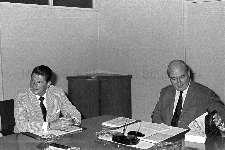 REPUBLICAN GOVERNOR OF CALIFORNIA RONALD REAGAN (LEFT) CALLS ON THE CHAIRMAN OF THE INTERNATIONAL CHAMBER OF COMMERCE KEN GOULD AT DENMARK HOUSE. REAGAN IS UNITED STATES PRESIDENT RICHARD NIXON'S EMISSARY TO ASIA AND IS ON A 16-DAY TOUR OF ASIA