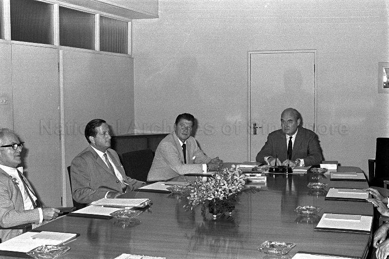 REPUBLICAN GOVERNOR OF CALIFORNIA RONALD REAGAN (THIRD LEFT) CALLS ON THE CHAIRMAN OF THE INTERNATIONAL CHAMBER OF COMMERCE KEN GOULD (RIGHT) AT DENMARK HOUSE. REAGAN IS UNITED STATES PRESIDENT RICHARD NIXON'S EMISSARY TO ASIA AND IS ON A 16-DAY TOUR OF ASIA