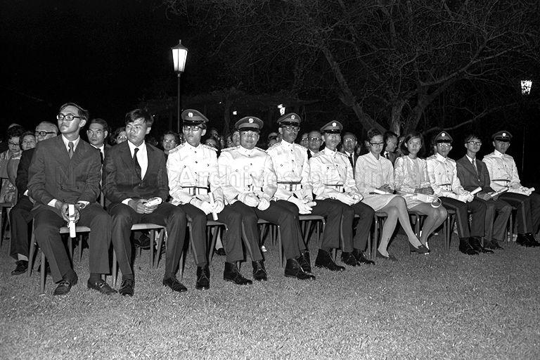 SINGAPORE'S 11 PRESIDENT SCHOLARS RECEIVED THEIR AWARDS FROM PRESIDENT DR BENJAMIN HENRY SHEARES IN A FLOODLIT CEREMONY AT THE ISTANA. AMONG THEM ARE TWO WOMEN WHO WILL BE LAUNCHING OUT AFTER THEIR TERTIARY EDUCATION INTO MALE PRESERVES. THE PRESIDENT'S SCHOLARS ARE, FROM LEFT: ALAN CHAN HENG LOON, CHIANG SHAO SOONG, CHOO CHUN WEI, CHUA CHIN KIAT, WESLEY GERARD S'ARANJO, GOH LIANG KWANG, MISS HO CHING, MISS LIM KOK HUANG, RICHARD LIM KOON HENG, WINSTON SEAH KAR HENG, DAVID WONG CHEONG FOOK. THE CEREMONY WAS ATTENDED BY PRIME MINISTER LEE KUAN YEW AND SEVERAL OTHER MINISTERS.