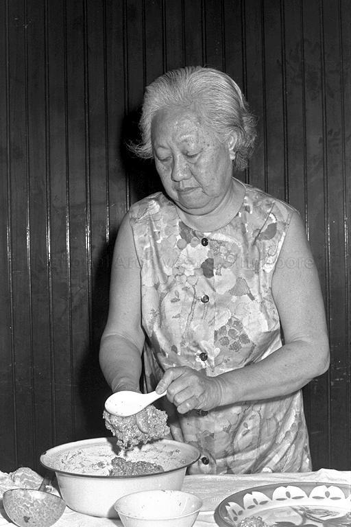 MOTHER OF PRIME MINISTER LEE KUAN YEW, MRS LEE CHIN KOON GAVE A DEMONSTRATION OF NONYA COOKING AT THE CONFERENCE HALL AS PART OF A COURSE TO RAISE FUNDS FOR LOCAL CHILDREN'S CHARITIES. THE PROGRAMME IS ORGANISED BY THE CHINESE WOMEN'S ASSOCIATION AND INCLUDES RECIPES FROM ALL THE ASSOCIATION OF SOUTH-EAST ASIAN NATIONS (ASEAN) MEMBERS.