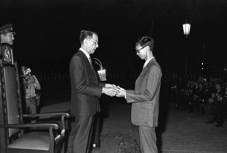 ALAN CHAN HENG LOON, ONE OF SINGAPORE'S 11 PRESIDENT SCHOLARS RECEIVING HIS AWARD FROM PRESIDENT DR BENJAMIN HENRY SHEARES IN A FLOODLIT CEREMONY AT THE ISTANA. AMONG THEM ARE TWO WOMEN WHO WILL BE LAUNCHING OUT AFTER THEIR TERTIARY EDUCATION INTO MALE PRESERVES