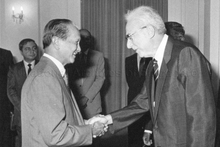 ITALIAN PRESIDENT FRANCESCO COSSIGA (RIGHT) PAYING COURTESY CALL ON PRESIDENT WEE KIM WEE DURING HIS TWO-DAY VISIT TO SINGAPORE