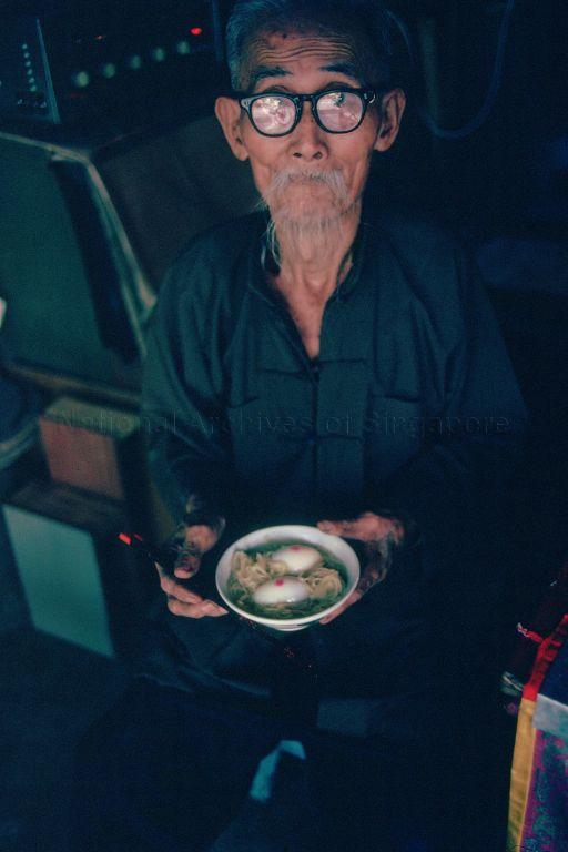 THE OLD CARPENTER FROM KIM YAM ROAD POSING WITH HIS TRADITIONAL BOWL OF EGG AND NOODLES CELEBRATING HIS 80TH BIRTHDAY PARTY