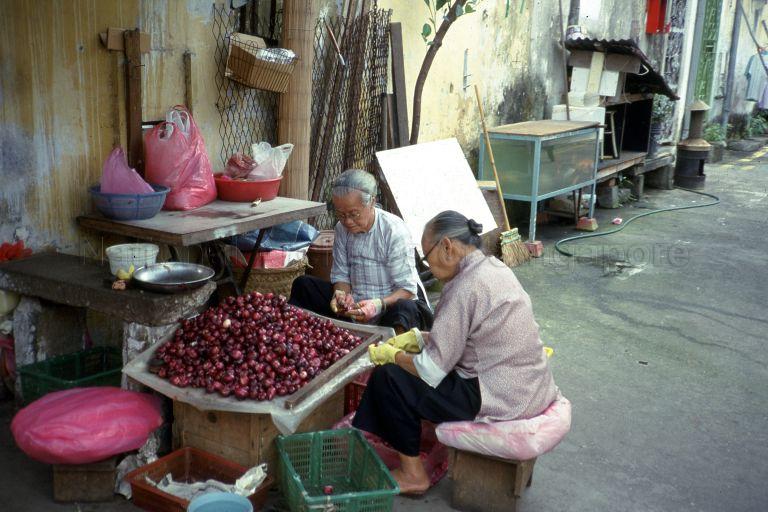 WOMEN AT CLARKE QUAY PEELING ONIONS, C.1980S