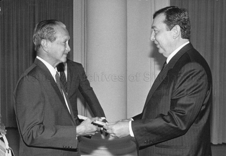 ISRAELI AMBASSADOR-DESIGNATE ISRAEL ELIASHIV (RIGHT) PRESENTING CREDENTIALS TO PRESIDENT WEE KIM WEE AT THE ISTANA