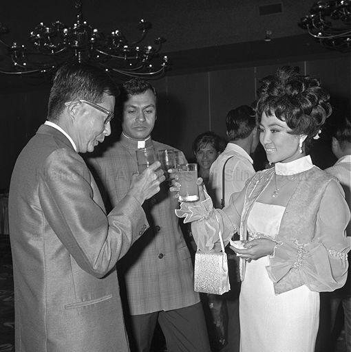 ACTING MINISTER FOR CULTURE WEE TOON BOON CLINKING GLASSES WITH VISITING HONG KONG FILM STAR MISS ANGELA YU CHIEN AT A RECEPTION AT HOTEL MALAYSIA. JOINING IN THE TOAST IS MALAYSIA ACTOR JINS SHAMSUDIN. THE TWO STARS, TOGETHER WITH 17 OTHERS, INCLUDNG 11 FROM INDONESIA WERE PRESENTED WITH CERTIFICATES OF APPRECIATION FOR THEIR PARTICIPATION IN THE SINGAPORE FILM FESTIVAL WEEK AT HOTEL MALAYSIA