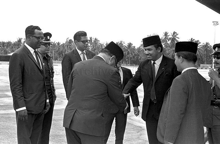 SULTAN HASSANAL BOLKIAH OF BRUNEI (SECOND RIGHT) ARRIVED IN SINGAPORE ON HIS WAY TO JOHORE. HE WILL BE IN JOHORE FOR A THREE-DAY VISIT AT THE INVITATION OF SULTAN ISMAIL OF JOHORE