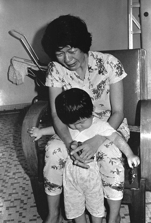 MADAM KUEK SAI FANG, WIFE OF TAN BIN KEONG, DIRECTOR OF HOCK PENG TRADING COMPANY AT THEIR HOME IN JALAN LIMBOK, OFF YIO CHU KANG ROAD. HER HUSBAND WAS KIDNAPPED AND SHE RECEIVED A LETTER DEMANDING $80,000 FOR THE RELEASE OF HER HUSBAND. PICTURE SHOWS MRS TAN IN TEARS WITH DAUGHTER HIAN TIM