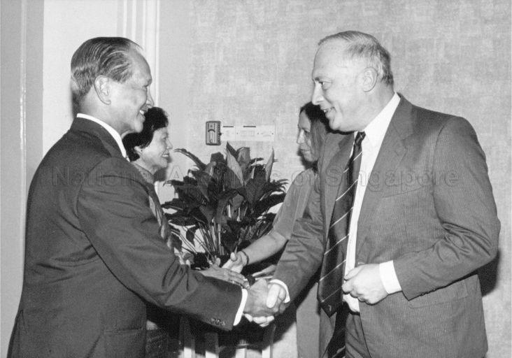 WEST GERMAN AMBASSADOR DR RICHARD LOUIS AND MRS LOUIS PAYING FAREWELL CALL ON PRESIDENT WEE KIM WEE (LEFT) AND MRS WEE AT THE ISTANA